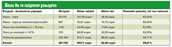 Μάλιστα, σε κάποιες ακραίες περιπτώσεις η μείωση οδηγεί σε μέρισμα πείνας. Είναι ενδεικτικό ότι για χήρους/χήρες με προστατευόμενα μέλη το μέσο νέο μέρισμα είναι μόλις 15,75 ευρώ τον μήνα από 42,61 ευρώ που ήταν έως τώρα.