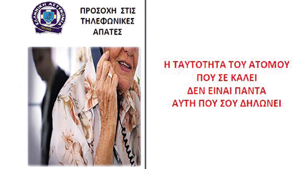 Μην εμπιστεύεστε αγνώστους που προσπαθούν να σας πείσουν από το τηλέφωνο να τους δώσετε χρήματα δήθεν για κάποια έκτακτη ανάγκη (π.χ. για νοσηλεία συγγενικού προσώπου), μη δεχτείτε οποιαδήποτε συνάντηση μαζί τους, ενημερώστε αμέσως την Αστυνομία αν αντιληφθείτε κάτι περίεργο.