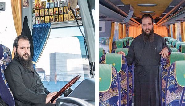 «Οταν οδηγώ, βγάζω το ράσο και έχω τα ρούχα που φοράνε συνήθως οι οδηγοί των ΚΤΕΛ, με το μπλε πουκάμισο» δηλώνει και προσθέτει: «Βεβαίως, υπάρχουν και πρακτικοί λόγοι, γιατί ένας οδηγός κάνει συχνές στάσεις για να βάλει και να βγάλει πράγματα από το λεωφορείο, οπότε το ράσο δεν βοηθάει πολύ. Οταν όμως τελειώσω το δρομολόγιό μου, το φοράω πάλι κανονικά».