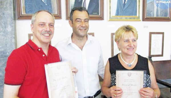 Οι έπαινοι απονεμήθηκαν χθες με απόφαση του δημάρχου της Ρόδου Φώτη Χατζηδιάκου, στο πλαίσιο του προγράμματος επιβράβευσης των επαναλαμβανόμενων επισκεπτών του νησιού. Την απονομή έκανε ο αντιδήμαρχος Πολιτισμού, Επικοινωνίας και ΜΜΕ Τέρης Χατζηιωάννου.