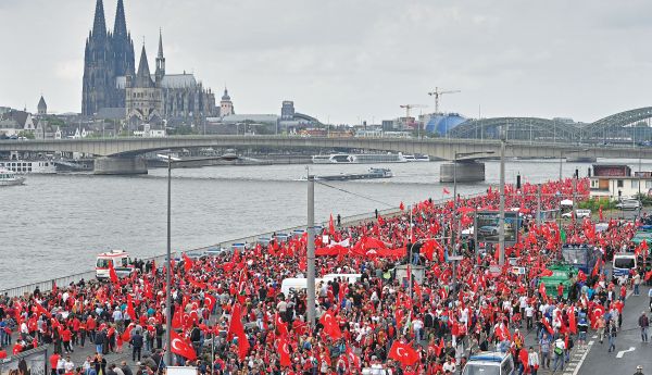 Μια πραγματική λαοθάλασσα με κόκκινες τουρκικές σημαίες στην Κολονία. Η συγκέντρωση των υποστηρικτών του Ερντογάν στη γερμανική μεγαλούπολη μάζεψε χθες περισσότερα από 50.000 άτομα, σύμφωνα με το περιοδικό «Focus», φρουρούμενα από δύναμη 2.700 αστυνομικών και ξεπερνώντας ακόμη και τους μεγαλύτερους υπολογισμούς των γερμανικών Αρχών. Παρότι όμως αντήχησε διαδοχικά ο τουρκικός και ο γερμανικός εθνικός ύμνος και τηρήθηκε ενός λεπτού σιγή για τα θύματα όχι μόνο της απόπειρας πραξικοπήματος στην Τουρκία αλλά και των επιθέσεων σε Παρίσι, Μόναχο, Νίκαια και Αγκυρα, ένα από τα κεντρικά συνθήματα ήταν υπέρ της επαναφοράς της θανατικής ποινής.