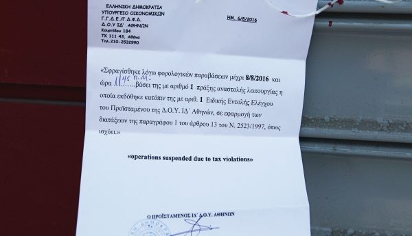 Σχεδόν ταυτόχρονα άλλο κλιμάκιο εφοριακών εφάρμοζε το μέτρο της διήμερης αναστολής λειτουργίας καταστημάτων που εντοπίζονται να φοροδιαφεύγουν, σε ταβέρνα στην Περαία Θεσσαλονίκης. Οι ελεγκτές έκαναν αιφνιδιαστικό έλεγχο στην επιχείρηση το απόγευμα της Παρασκευής και διαπίστωσαν ότι ο ιδιοκτήτης δεν είχε κόψει αποδείξεις σε 30 διαφορετικές παρέες που βρίσκονταν στο κατάστημα την ώρα του ελέγχου.
