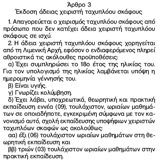 Σύμφωνα με τη νομοθεσία, οι προϋποθέσεις για να αποκτήσει κάποιος άδεια οδήγησης ταχύπλοου σκάφους είναι οι εξής: α) Να έχει συμπληρώσει το 18ο έτος της ηλικίας του, β) να είναι υγιής, κάτι που αποδεικνύεται με πιστοποιητικά από παθολόγο και οφθαλμίατρο ή με μια απλή φωτοτυπία διπλώματος Ι.Χ. ή μοτοσικλέτας σε ισχύ, γ) να γνωρίζει κολύμβηση, κάτι που… επιβεβαιώνεται με μια απλή υπεύθυνη δήλωση (!) του ενδιαφερομένου και δ) να έχει λάβει θεωρητική και πρακτική εκπαίδευση μόλις εννέα ωρών (έξι ωριαία θεωρητικά μαθήματα και τρία πρακτικά) από εγκεκριμένη σχολή.