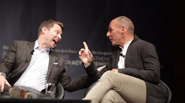 Στη διάρκεια της συζήτησης με συντονιστή τον νομπελίστα οικονομολόγο Πολ Κρούγκμαν οι τόνοι ανέβηκαν όταν ο Γιάνης Βαρουφάκης ήρθε σε αντιπαράθεση με το στέλεχος της Google Ρος Λα Ζενές για τις συνέπειες των νέων τεχνολογιών στον ανταγωνισμό και τη δημοκρατία. Ο πρώην υπουργός υποστήριξε ότι «η δημοκρατία αφορά τη διάχυση της ισχύος», αλλά στην εποχή της Google και της Apple, «η τεχνολογία οδηγεί σε συρρίκνωση του ανταγωνισμού και σε τεράστια συγκέντρωση οικονομικής και πολιτικής ισχύος». Ο κ. Λα Ζενές απάντησε ότι οι υπηρεσίες που παρέχει η εταιρεία του έχουν συμβάλλει πολύ θετικά στη διεύρυνση της δημοκρατίας. Επιπλέον, υποστήριξε ότι , η ψηφιακή επανάσταση έχει φέρει και στην οικονομία «αποκέντρωση της ισχύος» «Στην Google τρέμουμε κάθε μέρα, καθώς δεν υπάρχουν φραγμοί εισόδου για νέες εταιρείες με έξυπνες ιδέες. Ο κλάδος είναι γεμάτος με τα πτώματα εταιρειών που κάποτε θεωρούνταν αήττητες».