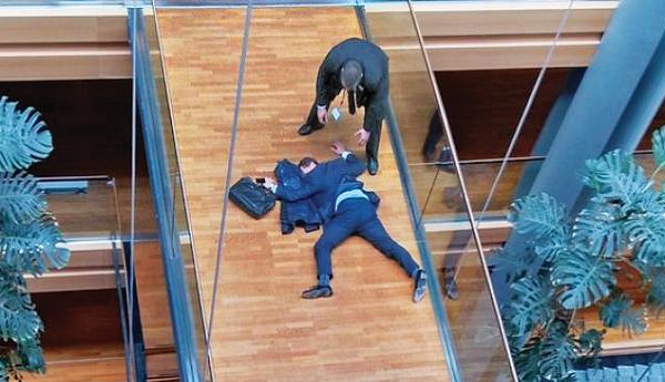 Εκεί μάρτυρες τον είδαν να δέχεται γρονθοκόπημα από άλλο ευρωβουλευτή του κόμματος – αργότερα υποστηρίχθηκε πως επρόκειτο για τον Μάικ Χούκεμ, αν και ο ίδιος το διαψεύδει. Από τη γροθιά χτύπησε το κεφάλι του σε κάποια σκληρή επιφάνεια. Μισή ώρα αργότερα, πάντως, εμφανίστηκε στην αίθουσα της Ολομέλειας. Εκεί όμως κατέρρευσε στα καλά καθούμενα και μεταφέρθηκε στο νοσοκομείο.