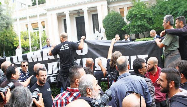 Πανό με το μήνυμα «Το μαύρο δεν έχει αποχρώσεις» ανάρτησαν χθες το μεσημέρι στα κάγκελα του Μεγάρου Μαξίμου εργαζόμενοι σε ιδιωτικούς τηλεοπτικούς σταθμούς, αιφνιδιάζοντας τους αστυνομικούς που προστατεύουν το κτίριο, οι οποίοι προσπάθησαν να εμποδίσουν τους εργαζομένους αλλά δεν το κατάφεραν. Στη συνέχεια οι εργαζόμενοι πέταξαν και φέιγ βολάν, ενώ κρατούσαν και πλακάτ με τα οποία απευθύνονταν ονομαστικά σε βουλευτές πρώην δημοσιογράφους.