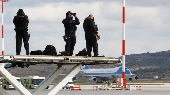 • Αξιωματικοί της ΕΛ.ΑΣ., στελέχη των Ειδικών Δυνάμεων της Αστυνομίας και Αμερικανοί πράκτορες -που αφίχθησαν στην Αθήνα την περασμένη Παρασκευή προκειμένου να προετοιμάσουν το έδαφος για την επίσκεψη του Μπαράκ Ομπάμα- ελέγχουν τις τελευταίες λεπτομέρειες λίγα λεπτά πριν το Air Force One προσγειωθεί στην πίστα του αεροδρομίου. Ελεύθεροι σκοπευτές βρίσκονται ακροβολισμένοι στα σημεία με την καλύτερη ορατότητα.