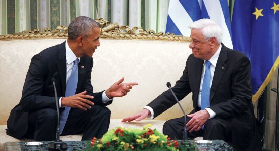 O Πρ. Παυλόπουλος υποδέχθηκε τον Μπαράκ Ομπάμα στην είσοδο του Προεδρικού και τον συνόδευσε στην αίθουσα «Βυζαντινό», όπου βρίσκονταν οι 130 προσκεκλημένοι. Ο Μπαράκ Ομπάμα στην αντιφώνησή του ευχαρίστησε για τη ζεστή φιλοξενία των Ελλήνων που, όπως ανέφερε, «δεν αποτελεί έκπληξη», εκφράζοντας την υποστήριξη των ΗΠΑ στην προσπάθεια των Ελλήνων να οδηγήσουν τη χώρα τους μπροστά, υποσχόμενος ότι στον αγώνα αυτόν οι ΗΠΑ θα βρίσκονται σταθερά στο πλευρό της Ελλάδας και έκλεισε λέγοντας στα ελληνικά «στην υγειά σας».