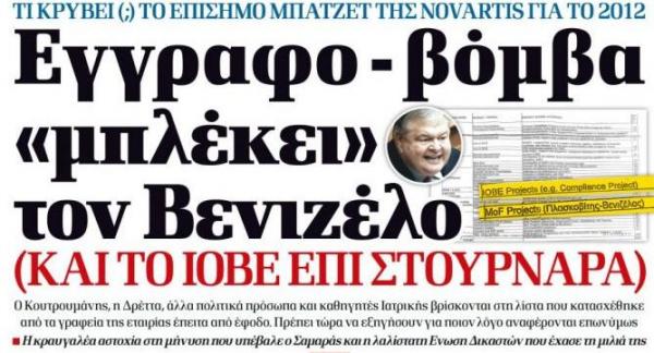 H «δημοκρατία» σήμερα αποκαλύπτει έγγραφο της Novartis που περιλαμβάνει τον κ. Βενιζέλο και άλλα πολιτικά πρόσωπα σε “προωθητικές ενέργειες”. Μάλιστα η εταιρεία προϋπολογίζει και συγκεκριμένο μπάτζετ!!! O κ. Βενιζέλος αντί να ζητήσει εξηγήσεις από τη Novartis ή να διαψεύσει την αυθεντικότητα του εγγράφου, απαντά ότι την επίμαχη περίοδο είχε αποχωρήσει από το Υπουργείο Οικονομικών και ήταν πρόεδρος του ΠΑΣΟΚ. Δηλαδή… ακόμα χειρότερα.