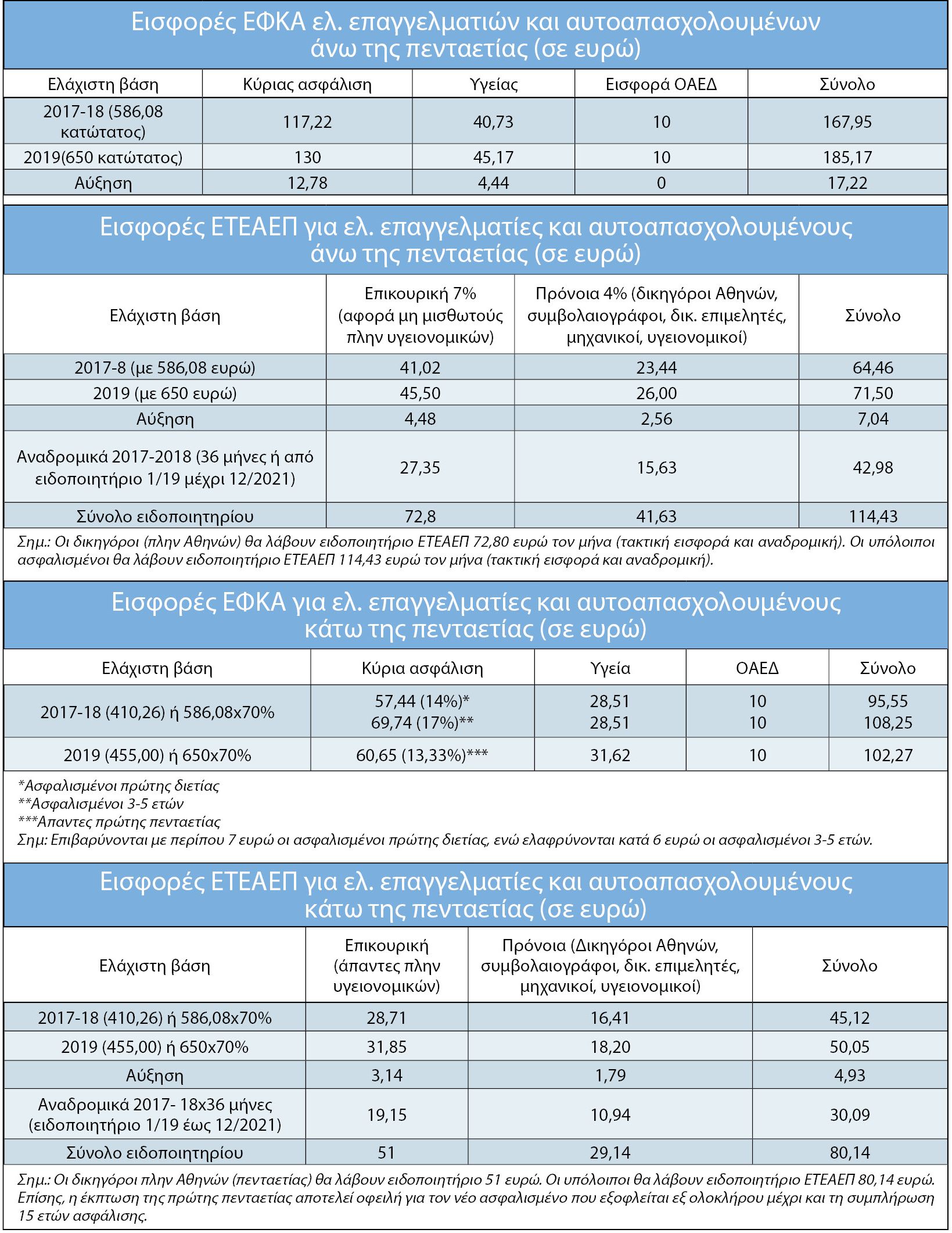 Συγκεκριμένα, οι ασφαλισμένοι αυτοί με δραστηριότητα άνω της πενταετίας, από 167,95 ευρώ τον μήνα υπέρ ΕΦΚΑ, θα κληθούν να πληρώνουν 185,17 ευρώ. Επίσης, υπέρ ΕΤΕΑΕΠ, από 64,46 ευρώ θα πρέπει να αποδίδουν 71,5 ευρώ τον μήνα, συν 42,98 ευρώ τον μήνα για τα αναδρομικά (επικούρηση και εφάπαξ) της διετίας 2017-2018! Αυξήσεις θα επέλθουν στις εισφορές του ΕΦΚΑ και για τους ελεύθερους επαγγελματίες και αυτοαπασχολουμένους κάτω της πενταετίας. Μέχρι σήμερα κατέβαλλαν εισφορές από 95,55 έως 108,25 ευρώ. Με την αύξηση του κατώτατου μισθού οι εισφορές θα φτάσουν στα 102,27 ευρώ. Οσοι ασκούν δραστηριότητα έως δύο έτη θα επιβαρυνθούν κατά 6,72 ευρώ, ενώ όσοι έχουν από τρία έως πέντε έτη θα έχουν ελάφρυνση 5,98 ευρώ τον μήνα.