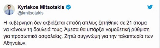 Η κυβέρνηση βάζει τέλος στις προκλητικές κινητοποιήσεις όπως η χθεσινή, η οποία κράτησε σε «ομηρία» 1.500.000 πολίτες!Νομοθετική ρύθμιση για τη λειτουργία του μετρό με προσωπικό ασφαλείας, ακόμα και σε περιπτώσεις στάσης εργασιών ή απεργιών, προανήγγειλε ο πρωθυπουργός Κυριάκος Μητσοτάκης, με αφορμή τη χθεσινή ταλαιπωρία των Αθηναίων από τη στάση εργασίας που αποφάσισαν αιφνιδιαστικά προχθές στο Σωματείο Εργαζομένων Λειτουργίας Μετρό Αθηνών (ΣΕΛΜΑ). «Η κυβέρνηση δεν εκβιάζεται επειδή απλώς ζητήθηκε σε 21 άτομα να κάνουν τη δουλειά τους. Αμεσα θα υπάρξει νομοθετική ρύθμιση για προσωπικό ασφαλείας. Ζητώ συγγνώμη για την ταλαιπωρία των Αθηναίων» έγραψε στο twitter o Κυριάκος Μητσοτάκης.