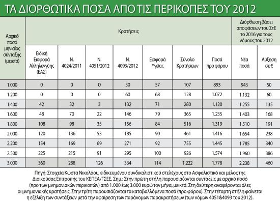 Από την πλευρά τους, το ύψος των αναδρομικών που διεκδικούν οι συνταξιούχοι και οι περικοπές του 2012 από τις οποίες προέρχονται οι απαιτήσεις τους είναι οι εξής:
