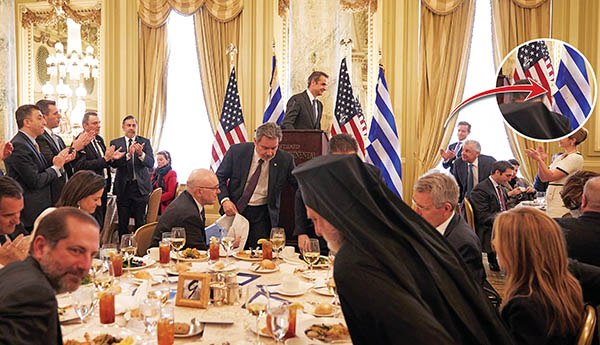 Ίσως οι υπουργοί (παρόντες ήταν ακόμη ο Αρχιεπίσκοπος Αμερικής, ο Αμερικανός πρέσβης στην Αθήνα Τζέφρι Πάιατ και πολλοί ομογενείς) να μην πρόσεξαν ότι η σημαία ήταν ανάποδα γιατί, όπως διακρίνεται στη φωτογραφία, είχαν πέσει με τα… μούτρα στα εδέσματα του τραπεζιού. Δεν θέλουμε να πιστέψουμε ότι σκέφθηκαν και αυτοί όπως ο Θεόδωρος Πάγκαλος στην κρίση των Ιμίων… «Ενα κομμάτι πανί είναι». Οπως και να έχει πάντως, η κυβέρνηση και οι ομογενείς εξέθεσαν την Ελλάδα με την εικόνα αυτή. Είναι βέβαιο ότι οι Τούρκοι γείτονές μας θα γελάνε με το γεγονός ότι ο κ. Μητσοτάκης πήγε στις ΗΠΑ για να υπερασπιστεί τα κυριαρχικά δικαιώματα της Ελλάδας και δεν πρόσεξε ότι το σύμβολο «πλήττεται» εκ των έσω.