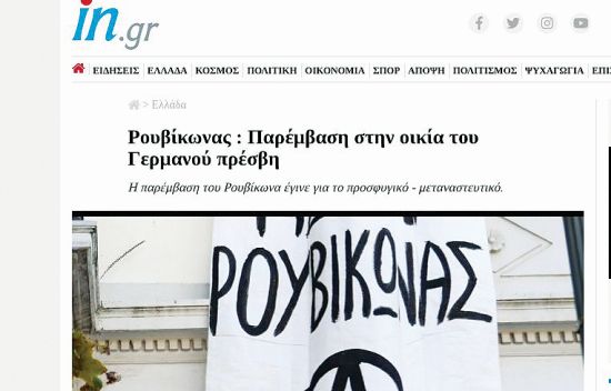 1 Η ειδησεογραφική σελίδα in.gr του πάλαι ποτέ… αστικού Δημοσιογραφικού Οργανισμού Λαμπράκη, που σήμερα ανήκει στον Βαγγέλη Μαρινάκη, όταν αναφέρεται στα χτυπήματα του Ρουβίκωνα τα περιγράφει με τη λέξη «επίθεση». Στο χτύπημα, όμως, που έγινε το περασμένο Σάββατο στην οικία του Γερμανού πρέσβη, δηλαδή δύο ημέρες μετά την επίθεση στα γραφεία της «δημοκρατίας», το σάιτ επέλεξε τη λέξη «παρέμβαση».