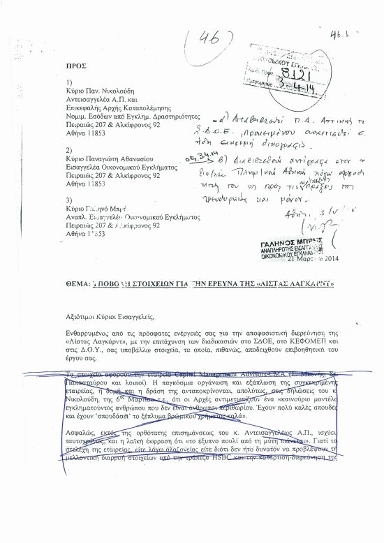 Μία ακόμα απόδειξη είναι το γεγονός πως η έρευνα για τη «λίστα Λαγκάρντ» είχε αρχίσει μήνες πριν από την υποτιθέμενη επιστολή, ενώ μάλιστα, τον Αύγουστο του 2015, είχαν κληθεί για κατάθεση και μάρτυρες ως ύποπτοι. Η μεγαλύτερη απόδειξη, όμως, είναι μια άλλη επιστολή, ανώνυμη, που παρουσιάζουμε στη «δημοκρατία» και η οποία στάλθηκε έναν χρόνο πριν από την ημερομηνία που αναφέρει ο κ. Αθανασίου, δηλαδή τον Απρίλιο του 2014. Η συγκεκριμένη επιστολή περιέχει πλήθος πληροφοριών για ενέργειες προσώπων που αναφέρονται στη «λίστα Λαγκάρντ», αλλά στάλθηκε στον ίδιο την περίοδο που ήταν οικονομικός εισαγγελέας και όχι στον κ. Παπαγγελόπουλο. Βρέθηκε στα χέρια μας καθώς συμπεριλαμβανόταν στη δικογραφία υπόθεσης της «δημοκρατίας», η οποία εκδικάστηκε στη Βρετανία.