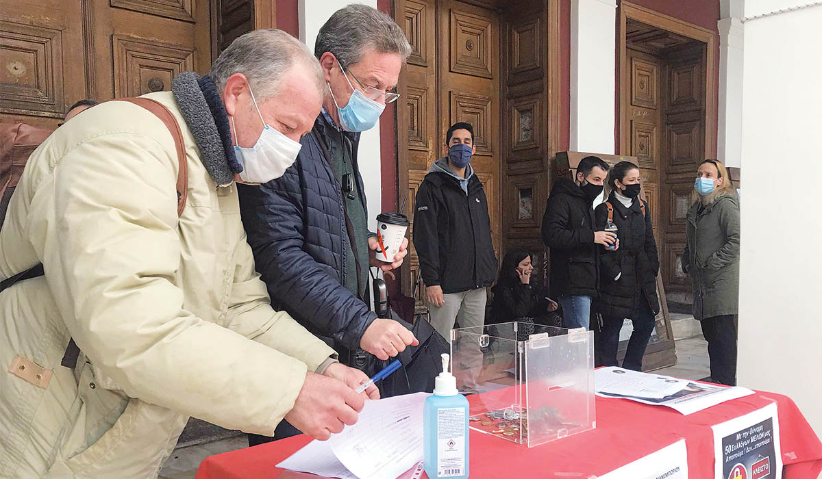 Οι επιχειρηματίες και μέλη του Εμπορικού και Εισαγωγικού Συλλόγου Πάτρας συγκεντρώθηκαν στην πλατεία Γεωργίου κρατώντας πανό και έβαλαν τα κλειδιά των καταστημάτων τους σε ένα κουτί για να πιέσουν την κυβέρνηση να ανακοινώσει την άρση της απόφασης που κρατάει κλειστά τα εμπορικά καταστήματα.