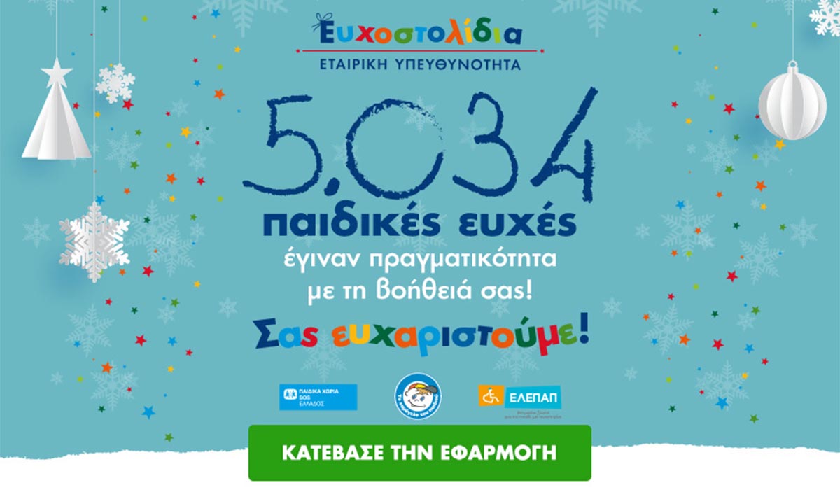 Η εντυπωσιακή ανταπόκριση όλων στην πρωτοβουλία Ευχοστολίδια είχε ως αποτέλεσμα να έχουν γίνει ήδη πραγματικότητα 5.034 χριστουγεννιάτικες ευχές παιδιών από «Το Χαμόγελο του Παιδιού», τα Παιδικά Χωριά SOS και την ΕΛΕΠΑΠ.