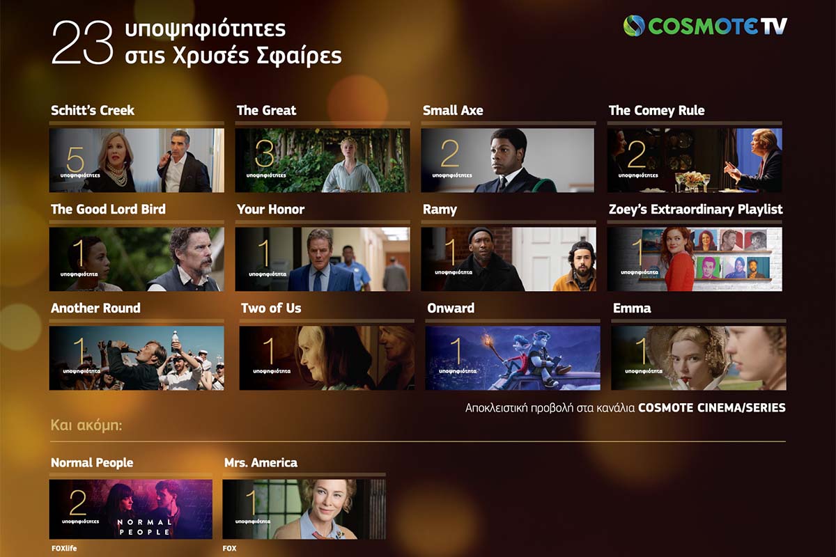 Συνολικά 23 Χρυσές Σφαίρες διεκδικούν στη φετινή τελετή απονομής τηλεοπτικές και κινηματογραφικές παραγωγές, που προβάλλονται στην COSMOTE TV. Σε συνέχεια της ανακοίνωσης των φετινών υποψηφιοτήτων, η κωμική σειρά Schitt’s Creek οδηγεί τη φετινή κούρσα, διεκδικώντας 5 βραβεία, ενώ με 3 υποψηφιότητες ακολουθεί το πολυσυζητημένο The Great με την Ελ Φάνινγκ και τον Νίκολας Χολτ. Χρυσή Σφαίρα διεκδικούν και άλλοι μεγάλοι all-starcast τίτλοι της COSMOTETV, όπως το Your Honor με τον Μπράιαν Κράνστον (Breaking Bad, Your Honor) και το The Good Lord Bird με τον ΊθανΧοκ.