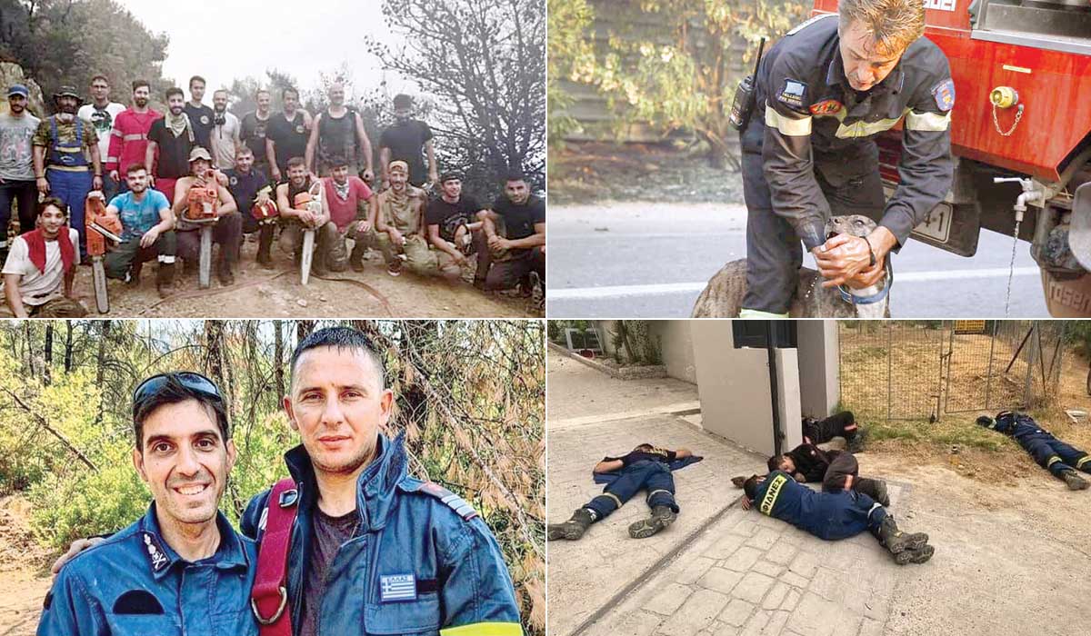 Δεν γνωρίζουμε πόσες ώρες πάλευαν με το «θηρίο». Σίγουρα θα ήταν πολλές. Οσο, όμως, εκπαιδευμένος και να είσαι, κάποια στιγμή δεν αντέχεις. Λυγίζεις. Τα πόδια και τα χέρια σου τρέμουν. Θέλεις να πας σε μια γωνιά, ακόμα και αν αυτή είναι στο έδαφος ή ακόμα και στο τσιμέντο. Να κλείσεις τα μάτια σου και να ξεκουραστείς. Εστω και λίγες στιγμές. Να ανασυντάξεις τις δυνάμεις σου ώστε να ριχτείς πάλι μέσα στη μάχη, για να σώσεις ό,τι μπορείς. Αυτό έκαναν οι πυροσβέστες της φωτογραφίας.