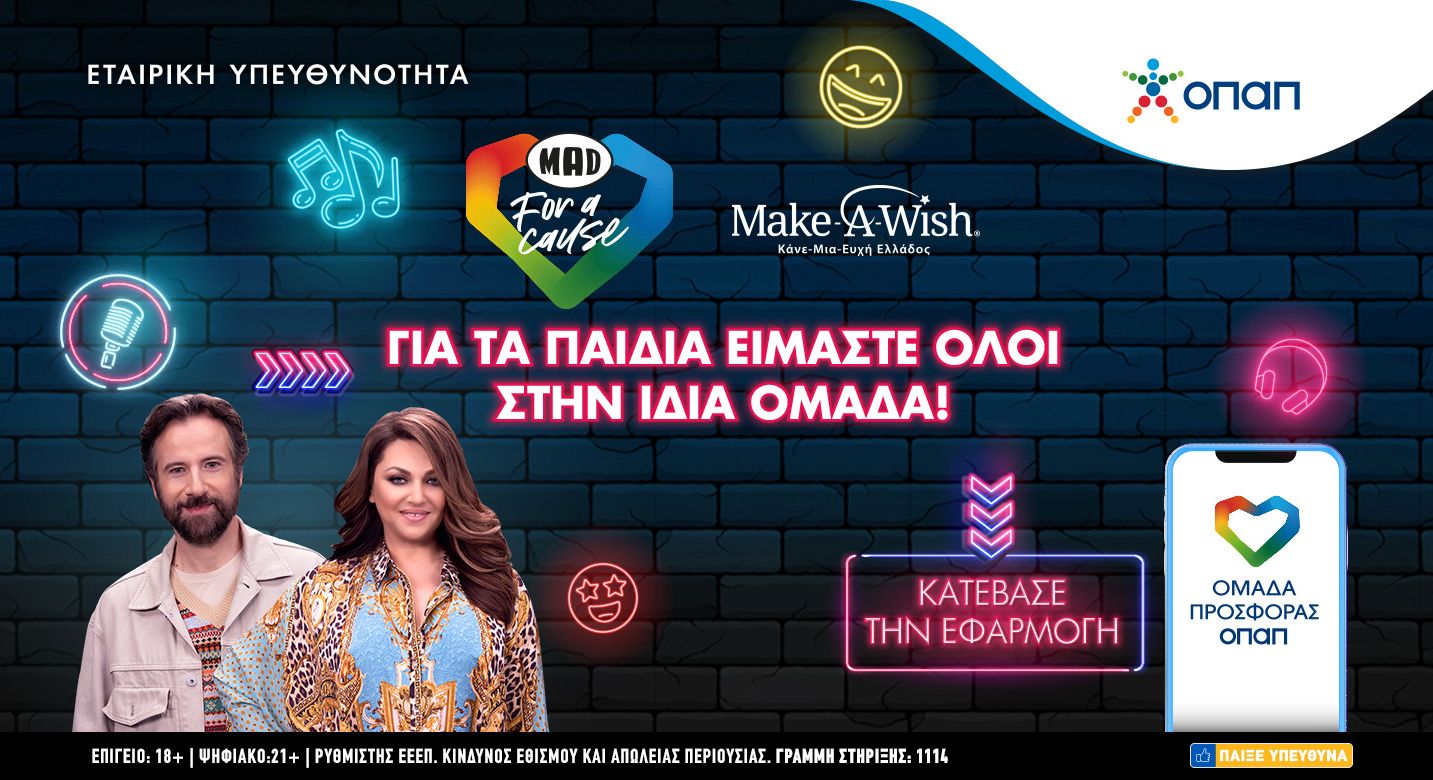 Με ένα δωρεάν download της εφαρμογής «Ομάδα Προσφοράς ΟΠΑΠ» ενισχύουμε την πρωτοβουλία “MAD for a Cause” και κάνουμε πραγματικότητα τις ευχές τεσσάρων παιδιών του Make-A-Wish (Κάνε-Μια-Ευχή Ελλάδος), που πάσχουν από σοβαρά νοσήματα. Παράλληλα, διεκδικούμε δύο δώρα εμπειρίας από την Καίτη Γαρμπή και τον Κωστή Μαραβέγια, οι οποίοι υποστηρίζουν αυτή την σημαντική πρωτοβουλία του ΟΠΑΠ για τα παιδιά.