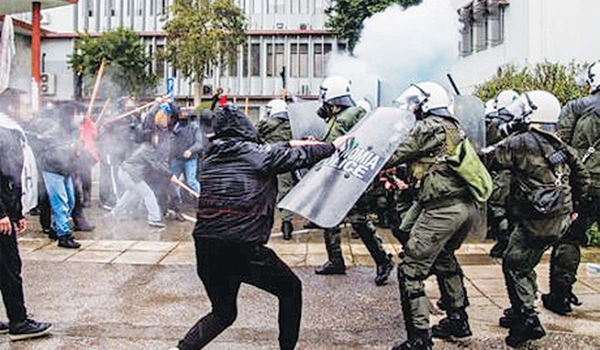 Μπροστά από ομάδα φοιτητών που διαμαρτύρονταν έξω από το κτίριο ένας άνδρας μεγαλύτερης ηλικίας προκάλεσε αστυνομικούς των ΜΑΤ ρωτώντας αν φορούν παντελόνια, κάνοντας, μάλιστα, κίνηση να ακουμπήσει και να τραβήξει τα ρούχα ενός από αυτούς.