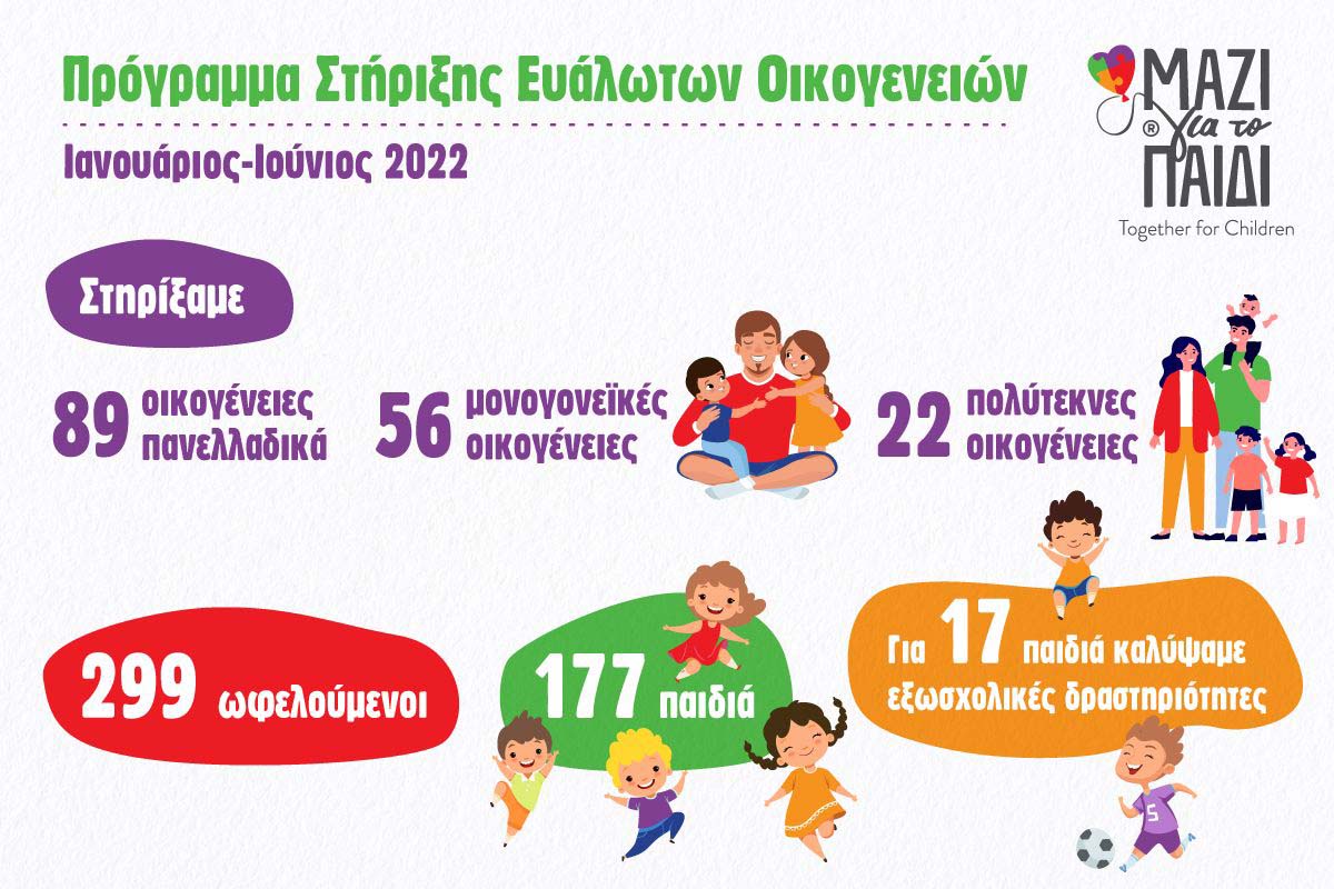 Πιο συγκεκριμένα το «Μαζί για το Παιδί»  το α ’ εξάμηνο του 2022 παρείχε στήριξη  σε 177 παιδιά από 89  οικογένειες σε όλη την Ελλάδα που βρίσκονταν στο όριο της φτώχειας. Στόχος του «Μαζί για το Παιδί» είναι να βελτιώσει τις συνθήκες ζωής οικογενειών με ανήλικα παιδιά που βρίσκονται σε οικονομική δυσχέρεια και σε κοινωνικό αποκλεισμό.