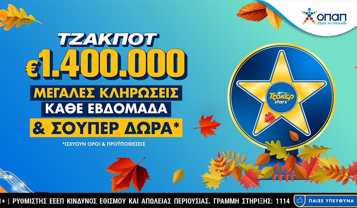 Για το πρόγραμμα επιβράβευσης TΖΟΚΕΡ Stars ισχύουν όροι και προϋποθέσεις. Οι παίκτες μπορούν να μάθουν περισσότερα μπαίνοντας στο tzoker.gr ή κατεβάζοντας την ανανεωμένη εφαρμογή ΤΖΟΚΕΡ.