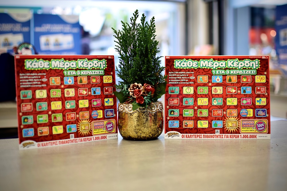 Το ΣΚΡΑΤΣ ημερολόγιο «ΚΑΘΕ ΜΕΡΑ ΚΕΡΔΗ», το οποίο κοστίζει 15 ευρώ, μοιράζει κέρδη έως και 1.000.000 ευρώ, ενώ ένας στους τρεις λαχνούς κερδίζει. Οι παίκτες αποκαλύπτουν ένα πεδίο κάθε ημέρα, σαν μια αντίστροφη μέτρηση για τη νέα χρονιά. Υπάρχουν 31 συν 1 ευκαιρίες για κέρδη.