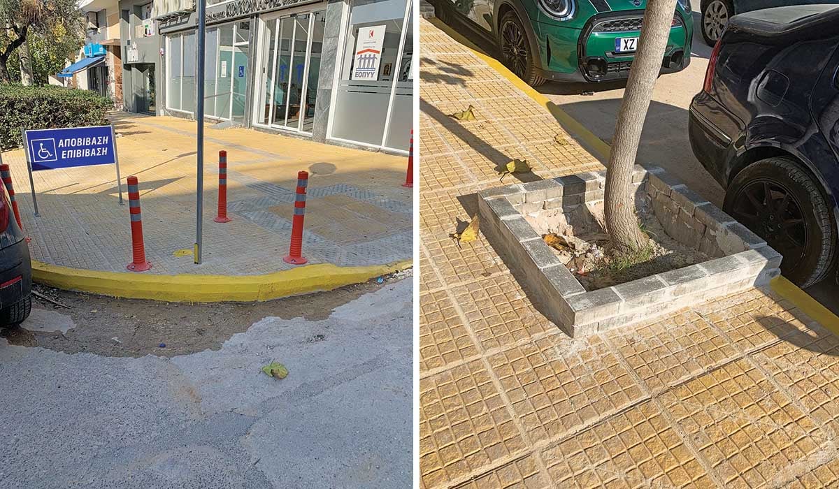Προς στιγμήν ο επιχειρηματίας δεν κατάλαβε, και μετά συνειδητοποίησε ότι η δημοτική Αρχή εννοούσε «αυθαίρετα κτίσματα» δύο κομψά παρτέρια από κυβόλιθους σε δέντρα του διπλανού πεζοδρομίου, τέσσερις πλαστικές κορύνες σήμανσης για τη ράμπα ΑμεΑ και μία πινακίδα για το σημείο επιβίβασης – αποβίβασης των υποβοηθούμενων επισκεπτών! Ευτυχώς δεν του είπαν να ξηλώσει και τη μεταλλική μπάρα στην είσοδο του εργαστηρίου, που διευκολύνει την είσοδο των αμαξιδίων συμπολιτών μας με κινητικά προβλήματα.