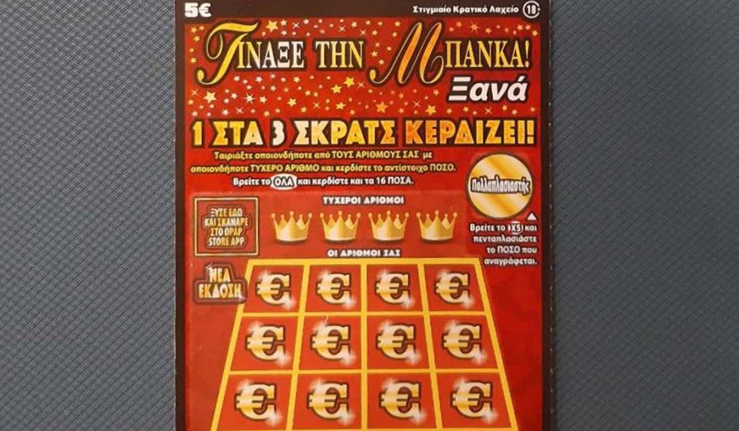 Κέρδη για μία πενταετία εξασφάλισε ένας τυχερός παίκτης του ΣΚΡΑΤΣ μέσα από το παιχνίδι «5 ΧΡΟΝΙΑ ΤΥΧΗ». Επισκέφθηκε ένα κατάστημα ΟΠΑΠ στη Θεσσαλονίκη, αγόρασε έναν λαχνό του παιχνιδιού αξίας 5 ευρώ, βρήκε το σύμβολο «5 ΧΡΟΝΙΑ» και κέρδισε 110.000 ευρώ κάθε χρόνο για την επόμενη πενταετία.