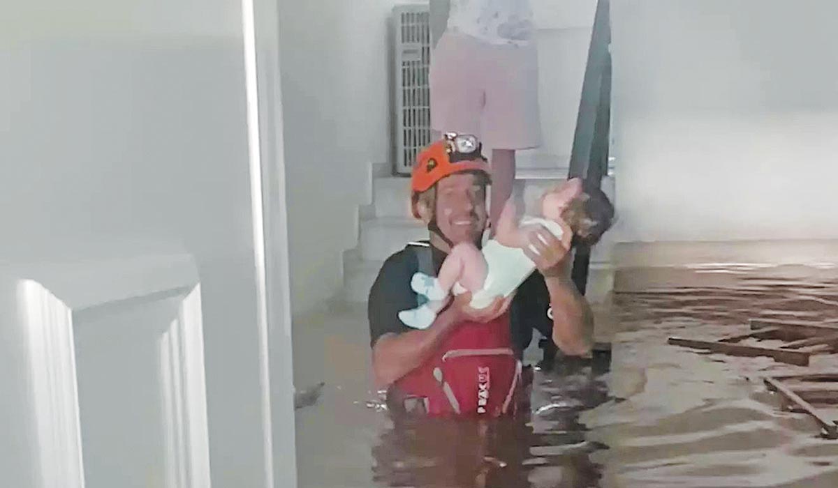 Μάλιστα, στον άνδρα της ΕΜΑΚ που έχει επιφορτιστεί με την επιχείρηση μεταφοράς της εγκλωβισμένης οικογένειας οι συνάδελφοί του λένε να προσέχει, ενώ ακούγονται από δίπλα οι λυγμοί της μητέρας του μωρού, η οποία έντρομη μέσα στη σωστική λέμβο παρακολουθεί τη διαδικασία. Ο διασώστης, περπατώντας μέσα σε νερά τουλάχιστον ενός μέτρου, κρατά στοργικά στα χέρια του το μωρό, λέγοντάς του «ψυχούλα μου» για να μη φοβηθεί. Στη συνέχεια ακούγεται να λέει στο βρέφος «έλα να το πάρει η μαμά στην αγκαλιά» και δίνει το παιδάκι στη μητέρα του, ολοκληρώνοντας έτσι με επιτυχία ακόμη μία δύσκολη αποστολή απεγκλωβισμού και διάσωσης.