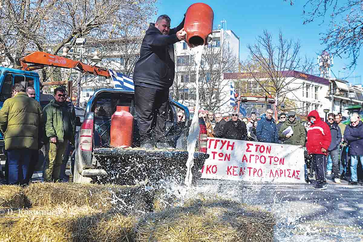 Εξάλλου, αγρότες και κτηνοτρόφοι έχυσαν γάλα της παραγωγής τους πάνω στις κατεστραμμένες από τις πλημμύρες αχυρένιες μπάλες στην κεντρική πλατεία της Λάρισας. Συμπληρώνοντας ένα 24ωρο από την παραμονή τους στο σημείο, οι αγρότες και οι κτηνοτρόφοι έστειλαν σαφή μήνυμα στην κυβέρνηση. «Κάποιοι δεν μπόρεσαν να ενημερώσουν τον πρωθυπουργό ότι το 70% που ξεσηκώθηκε είναι επαγγελματίες αγρότες, νέοι αγρότες. Δεν λένε την αλήθεια στον πρωθυπουργό. Ο εκπρόσωπός μας μάς αποκάλεσε “κοπριές”» παρατήρησε ο αγροτοσυνδικαλιστής Χρήστος Σιδηρόπουλος.