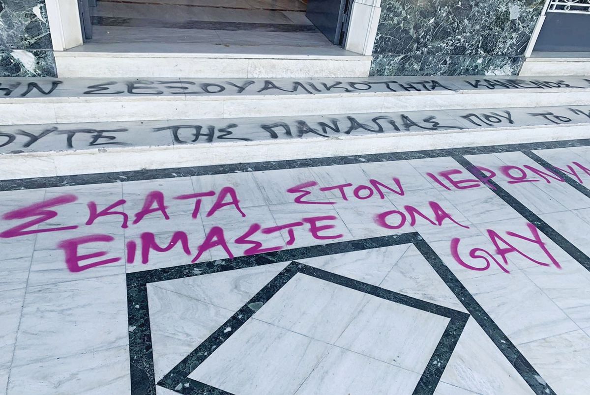 Αγνωστοι έγραψαν υβριστικά συνθήματα κατά της πίστης, της πατρίδας, της Παναγίας και υπέρ των γκέι στον Ιερό Ναό του Αγίου Αχιλλίου