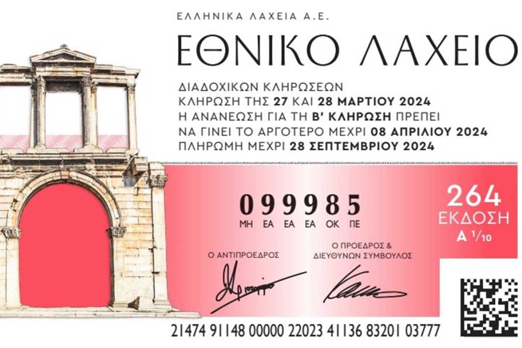 Οι κληρώσεις του Εθνικού Λαχείου για την 264η έκδοση ξεκινούν με την Α’ κλήρωση στις 27 Μαρτίου. Ακολουθεί η Β’ κλήρωση στις 9 Απριλίου, ενώ η Γ’ κλήρωση θα ξεκινήσει στις 22 Απριλίου. Η Δ’ Κλήρωση ξεκινά από τις 13 Μαΐου και ολοκληρώνεται στις 24 Μαΐου, όπου κληρώνεται και το μεγάλο έπαθλο του 1 εκατ. ευρώ.