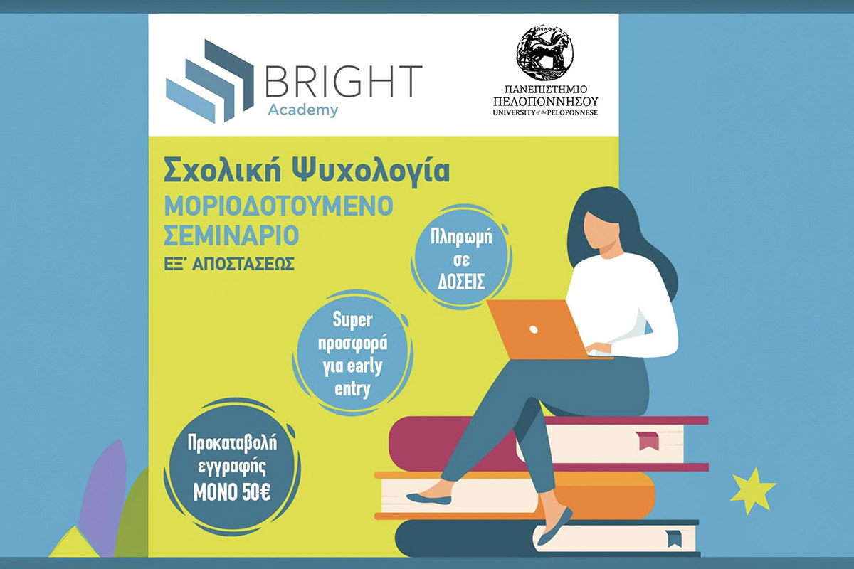 Με την υπογραφή της Bright Academy (https://www.brightacademy.gr/) και σε συνεργασία με το Πανεπιστήμιο Πελοποννήσου το προσεχές διάστημα θα υλοποιηθούν μοριοδοτούμενα σεμινάρια στη σχολική ψυχολογία (https://www.brightacademy.gr/programs/sxoliki-psixologia/). Η έναρξη των μαθημάτων του πρώτου κύκλου είναι τη Δευτέρα 8 Απριλίου 2024. Η μόνη προϋπόθεση που τίθεται ώστε να συμμετάσχει κάποιος/α στο προτεινόμενο πρόγραμμα είναι να είναι απόφοιτος ΑΕΙ ή πρώην ΤΕΙ. Η συνολική διάρκεια (σε αριθμό ωρών και αριθμό εβδομάδων) είναι 400 ώρες, 40 εβδομάδες, 9 μήνες. Η μέθοδος υλοποίησης και οι διαδικασίες παρακολούθησης είναι εξ αποστάσεως ασύγχρονη εκπαίδευση. Σκοπός είναι η αναλυτική παρουσίαση θεματικών περιοχών που συμπεριλαμβάνονται στις εφαρμογές της σχολικής ψυχολογίας. Μέσα από το περιεχόμενο του προγράμματος αναδεικνύεται ο ρόλος του σχολικού ψυχολόγου στη διασφάλιση ενός υποστηρικτικού περιβάλλοντος για τους/τις μαθητές/τριες.