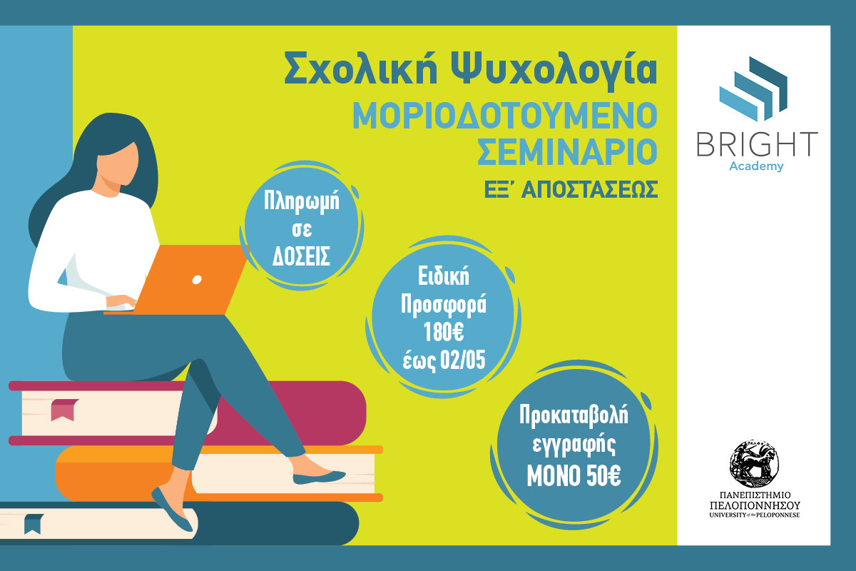 Ξεκίνησε ο νέος κύκλος αιτήσεων των μοριοδοτούμενων σεμιναρίων σχολικής ψυχολογίας και ειδικής αγωγής της Bright Academy (https://www.brightacademy.gr/) σε συνεργασία με το Πανεπιστήμιο Πελοποννήσου. Η έναρξη των μαθημάτων του επόμενου κύκλου είναι 17 Μαΐου 2024. Η συνολική διάρκεια του κάθε προγράμματος (σε αριθμό ωρών και αριθμό εβδομάδων) είναι 400 ώρες, 40 εβδομάδες, 9 μήνες. Η μέθοδος υλοποίησης και οι διαδικασίες παρακολούθησης είναι εξ αποστάσεως ασύγχρονη εκπαίδευση. Η ζήτηση είναι ιδιαίτερα μεγάλη από αναπληρωτές εκπαιδευτικούς Π.Ε. & Δ.Ε. επίσης ι από νέους αποφοίτους παιδαγωγικών σχολών, φοιτητές αλλά και όσους ενδιαφέρονται να εμπλουτίσουν τις γνώσεις τους και να δραστηριοποιηθούν σε αντίστοιχους τομείς.