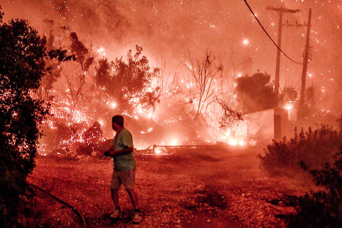 Τιτάνια μάχη με τις φλόγες δίνουν οι ισχυρές δυνάμεις της Πυροσβεστικής για τέταρτη ημέρα, αφού ο πύρινος εφιάλτης μαίνεται στην Κορινθία, με τις αναζωπυρώσεις και τους θυελλώδεις ανέμους να οδηγούν σε διαδοχικές εκκενώσεις χωριών. Χθες, η τεράστια φωτιά έφτασε στα βόρεια των Τρικάλων, με τους εκατοντάδες άνδρες της Πυροσβεστικής να δίνουν μάχη με πολλές διάσπαρτες εστίες. Μεγάλες αναζωπυρώσεις καταγράφηκαν σε Γελίνι, Σοφιανά, Σπατανέικα, Ψαθοχώρι, Ευρωστίνα και Μαύρο Ορος, ενώ νωρίς χθες το πρωί είχε σταλεί και προειδοποιητικό μήνυμα στους κατοίκους μέσω του 112. Σύμφωνα με την πρώτη αποτίμηση από τον υπουργό Πολιτικής Προστασίας Βασίλη Κικίλια, 40.000-50.000 στρέμματα γης έχουν μετατραπεί σε στάχτη, ενώ δύο νεκροί οικογενειάρχες και αμέτρητα καμένα σπίτια συμπληρώνουν το παζλ της φρίκης των τελευταίων ημερών.