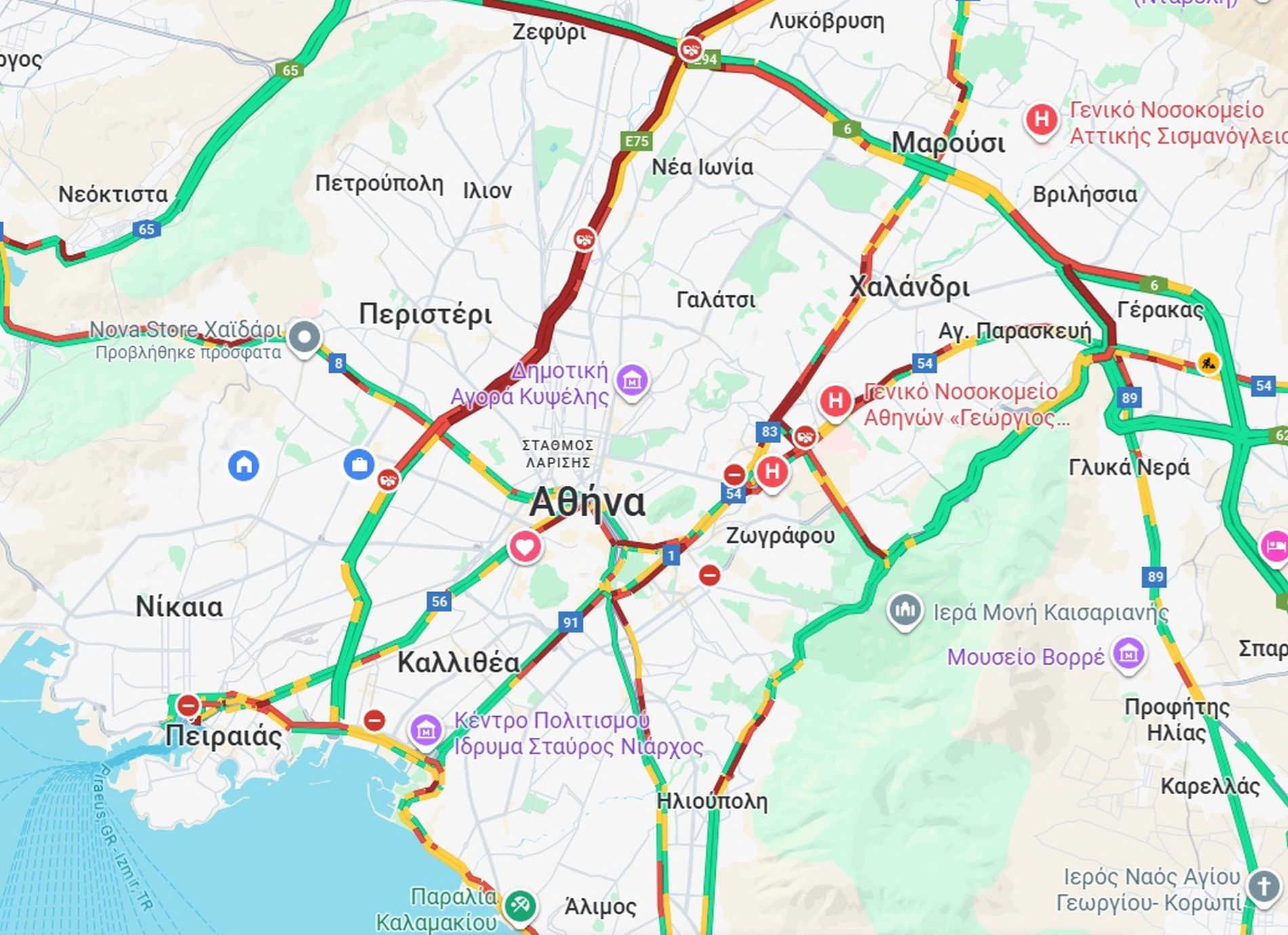 Παρόμοια εικόνα επικρατεί και στο κέντρο της πόλης. Η άνοδος της Πειραιώς, η Σταδίου, η Συγγρού, η Αρδηττού, η Βασιλέως Κωνσταντίνου, η Βασιλίσσης Σοφίας και η Ηλιουπόλεως βρίσκονται σε ασφυκτική συμφόρηση, με τα φανάρια να θυμίζουν περισσότερο… στάθμευση παρά κυκλοφορία. Οι καθυστερήσεις είναι συνεχείς, ενώ σε πολλά σημεία τα λεωφορεία δυσκολεύονται να κινηθούν, δημιουργώντας ακόμη μεγαλύτερη πίεση στους δρόμους.