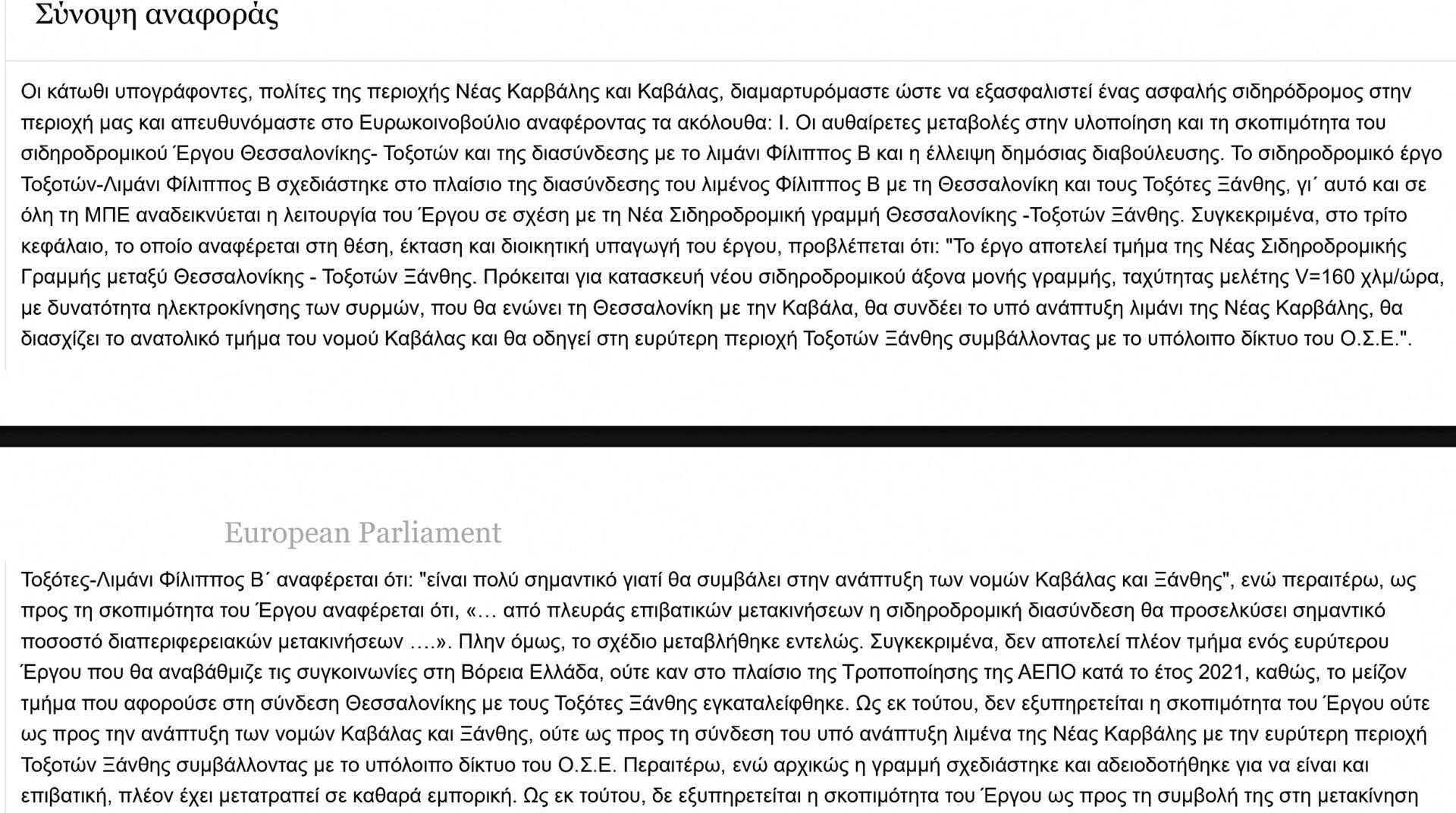 Η Ενωση σημειώνει πως «διαμαρτυρόμαστε ώστε να εξασφαλιστεί ένας ασφαλής σιδηρόδρομος στην περιοχή μας» και απευθύνεται στο Ευρωκοινοβούλιο για μια σειρά από ζητήματα, καταγγέλλοντας: