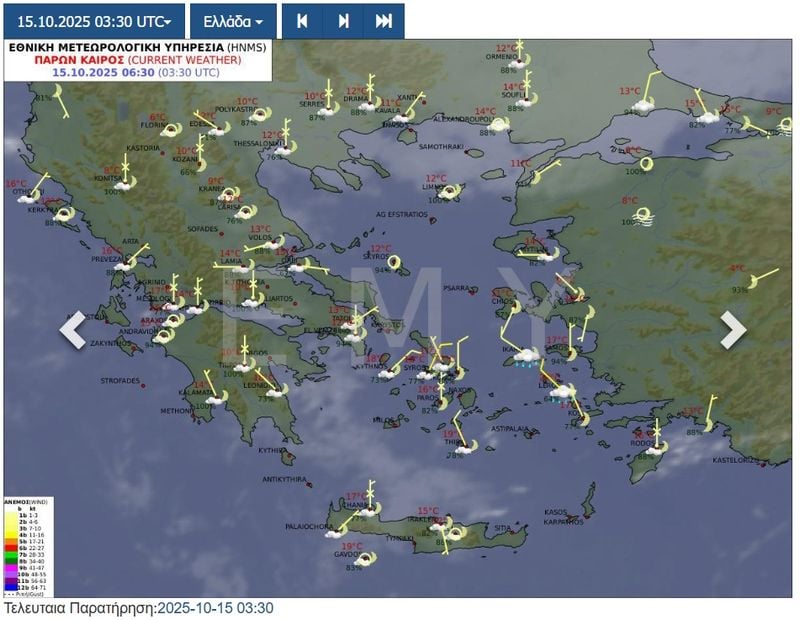 Η θερμοκρασία δεν θα σημειώσει αξιόλογη μεταβολή. Θα φτάσει στα βόρεια τους 19 με 21, στην υπόλοιπη χώρα τους 22 με 24 και στα Δωδεκάνησα έως 25 βαθμούς Κελσίου. Δείτε παρακάτω τον χάρτη της ΕΜΥ με τις σημερινές θερμοκρασίες: