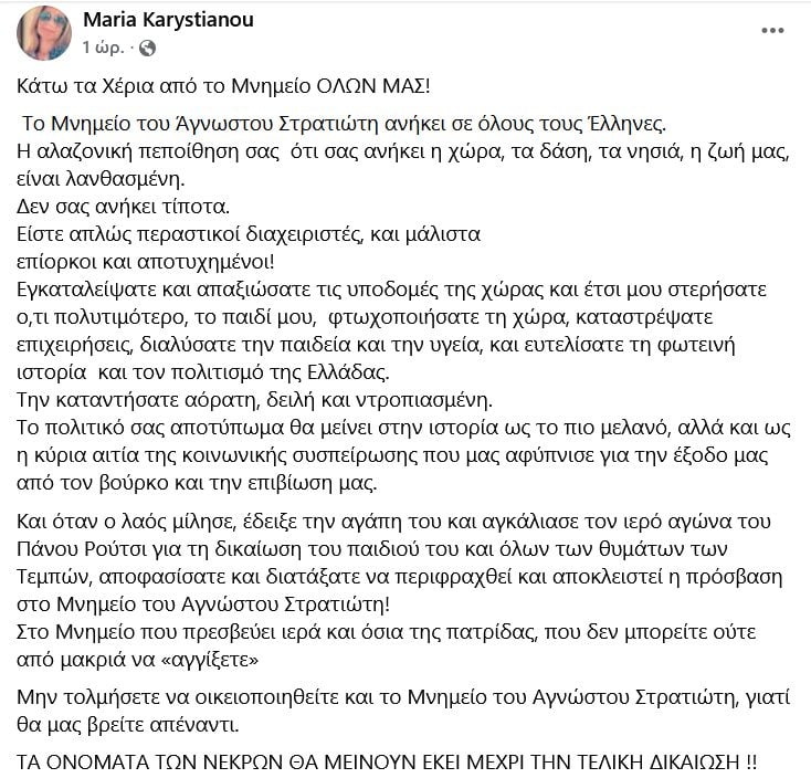 Και όταν ο λαός μίλησε, έδειξε την αγάπη του και αγκάλιασε τον ιερό αγώνα του Πάνου Ρούτσι για τη δικαίωση του παιδιού του και όλων των θυμάτων των Τεμπών, αποφασίσατε και διατάξατε να περιφραχθεί και αποκλειστεί η πρόσβαση στο Μνημείο του Αγνώστου Στρατιώτη!