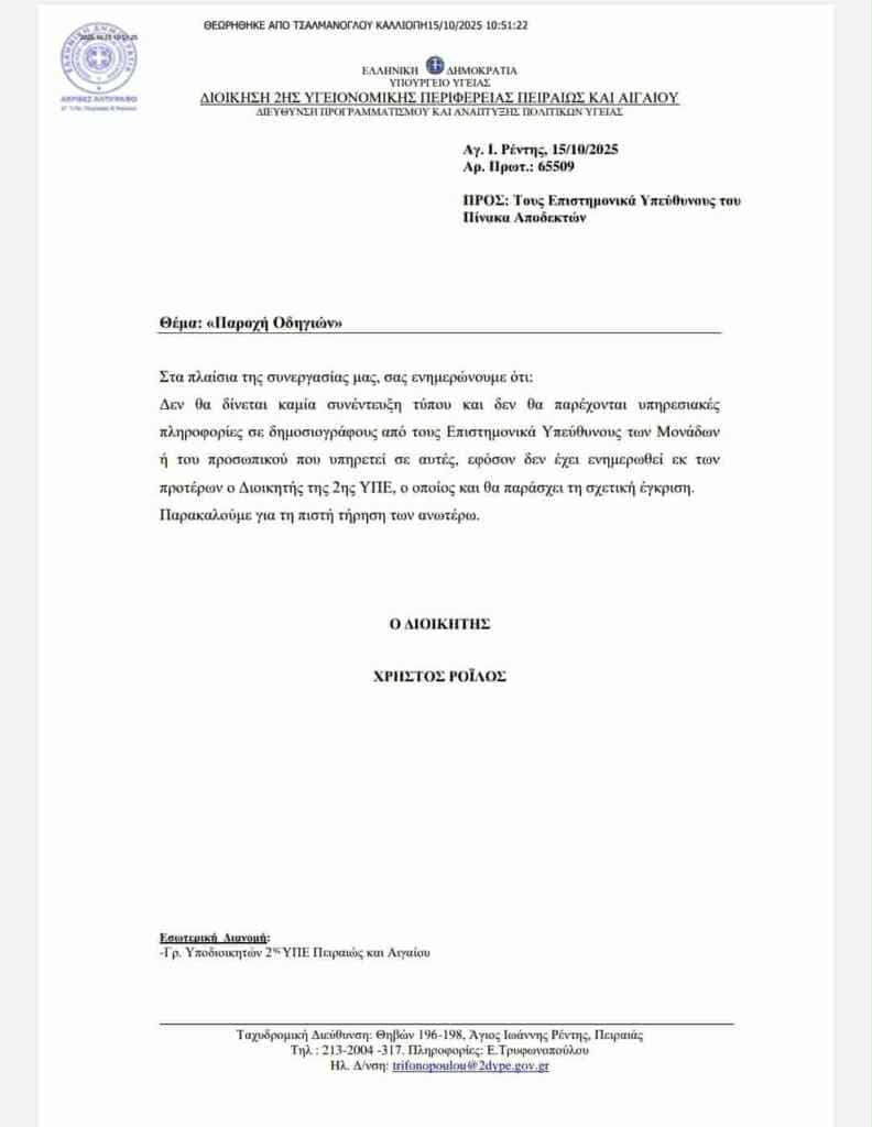 Με ένα «απίστευτο», όπως το χαρακτηρίζει η ΠΟΕΔΗΝ, έγγραφο ο Διοικητής της 2ης Υγειονομικής Περιφέρειας (ΥΠΕ) Χρήστος Ροϊλός, δίνει οδηγίες-εντολές σε εργαζόμενους και Επιστημονικά Υπευθύνους των Μονάδων Υγείας της 2ης ΥΠΕ, προκειμένου να μην συνομιλούν και να μην παρέχουν πληροφορίες σε δημοσιογράφους χωρίς την έγκρισή του.
