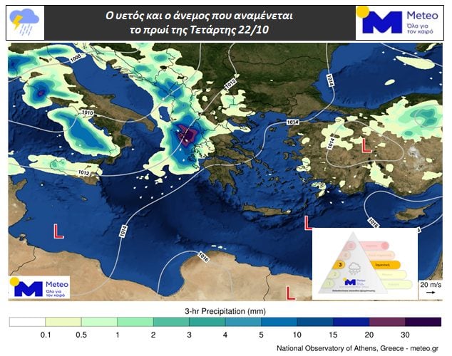 Χάρτης 1. Ο υετός και ο άνεμος που αναμένονται το πρωί της Τετάρτης 22/10
