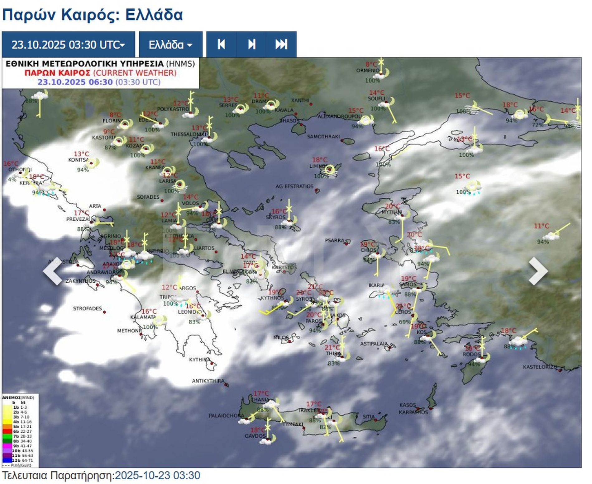 Ένα πέρασμα αστάθειας επηρεάζει σήμερα μεγάλο μέρος της χώρας, φέρνοντας βροχές, καταιγίδες και πυκνές νεφώσεις κυρίως στα δυτικά, τις Κυκλάδες και το ανατολικό Αιγαίο. Παρά τα φαινόμενα, η θερμοκρασία παραμένει σχετικά ήπια, με τιμές έως 25 βαθμούς Κελσίου, θυμίζοντας περισσότερο φθινοπωρινή «άνοιξη» παρά Οκτώβρη.