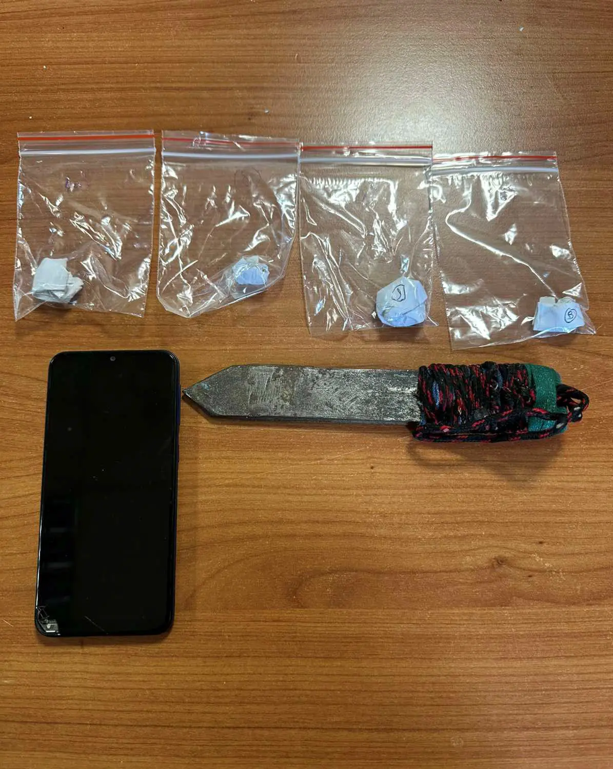 Τρεις χάρτινες συσκευασίες που περιείχαν άγνωστα τριμμένα ναρκωτικά δισκία, συνολικού βάρους 2,7 γραμμαρίων, χάρτινη συσκευασία που περιείχε άγνωστη σκόνη, βάρους -0,9- γραμμαρίων, αυτοσχέδιο μαχαίρι και κινητό τηλέφωνο με κάρτα sim.