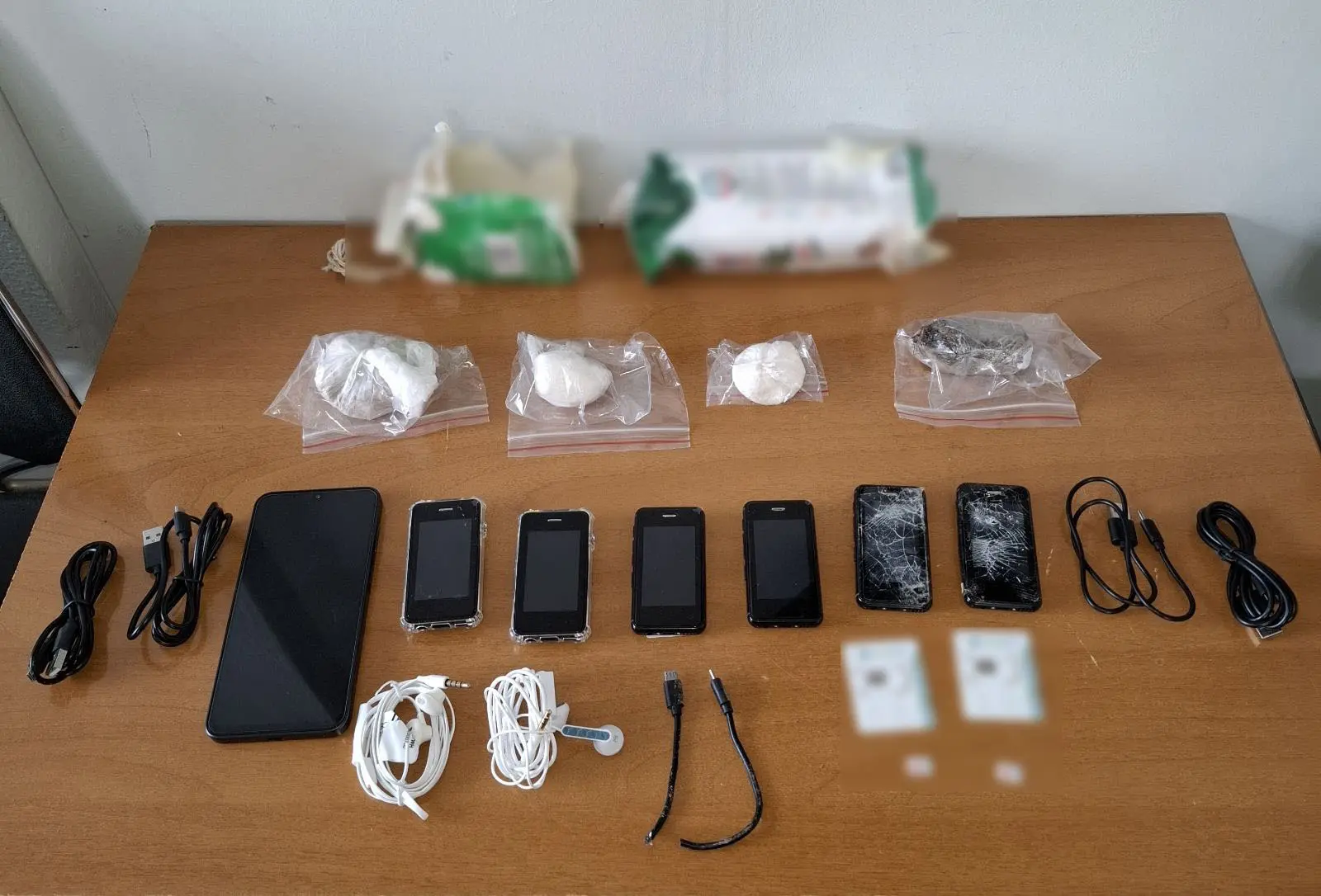 Νάιλον συσκευασία με ποσότητα ηρωίνης, σε μορφή βράχου, βάρους 48 γραμμαρίων, δύο νάιλον συσκευασίες με ποσότητες κοκαΐνης, σε μορφή βράχου και σκόνης, συνολικού βάρους 31 γραμμαρίων, νάιλον συσκευασία με ποσότητα κατεργασμένης κάνναβης, σε μορφή σοκολάτας, βάρους 61,2 γραμμαρίων, επτά κινητά τηλέφωνα και κάρτες sim, καλώδια φόρτισης και καλώδια handsfree.