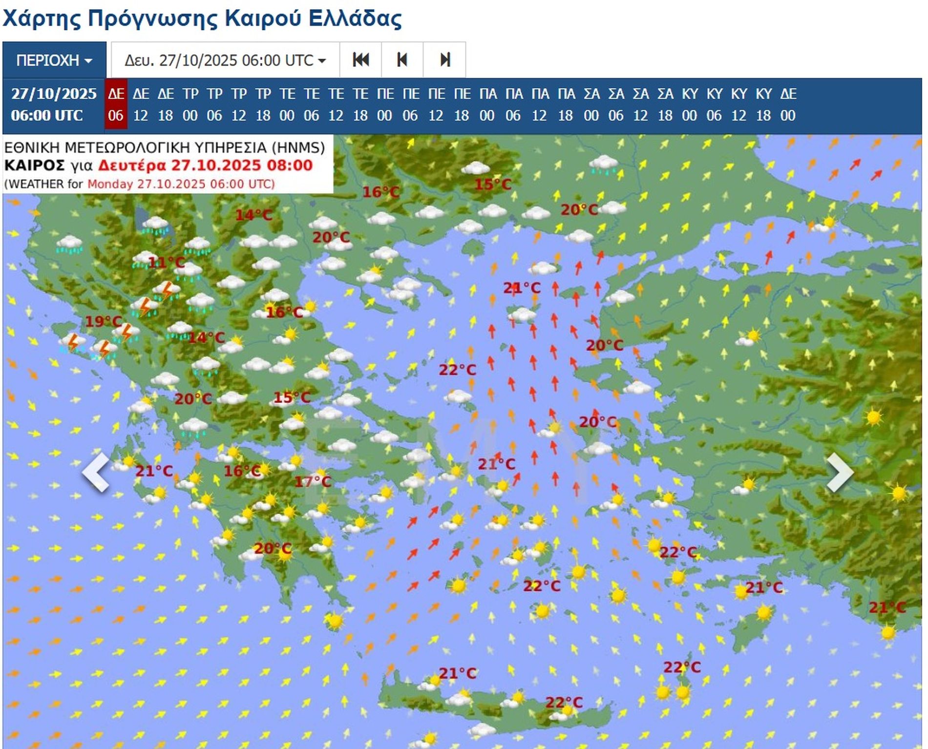 Θερμοκρασία: Από 17 έως 28 και τοπικά στην Κρήτη έως 29 με 30 βαθμούς Κελσίου.