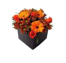 Διαχρονικά κομψά τριαντάφυλλα με γεμάτα μπουμπούκια και δροσερό άρωμα, ευωδιαστές ζέρμπερες και χρυσάνθεμα σε πορτοκαλί χρώμα, τοποθετημένα σε ένα μαύρο κουτί πολυτελείας είναι top decor item.