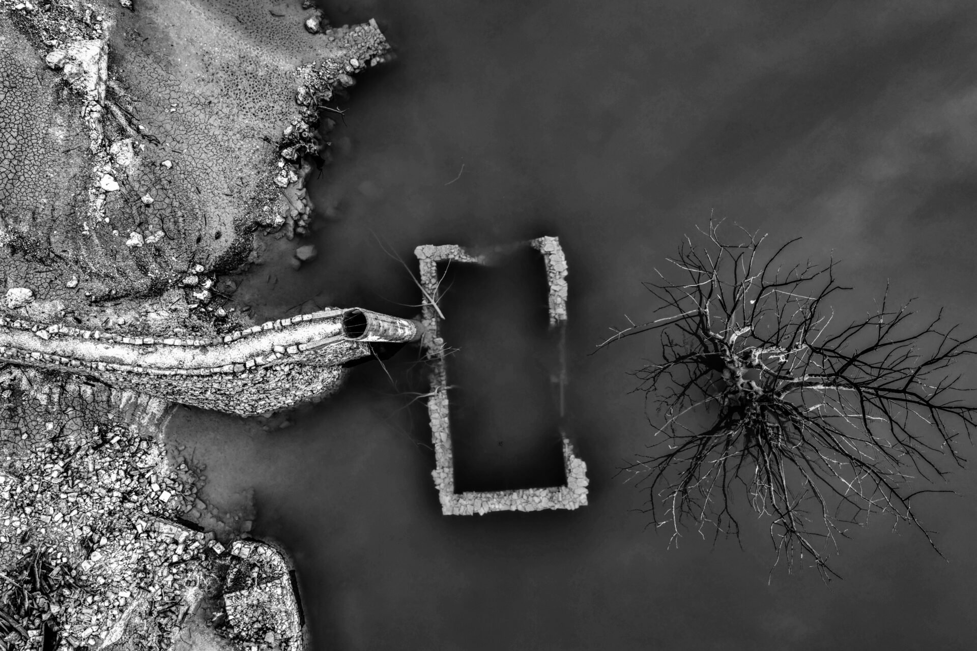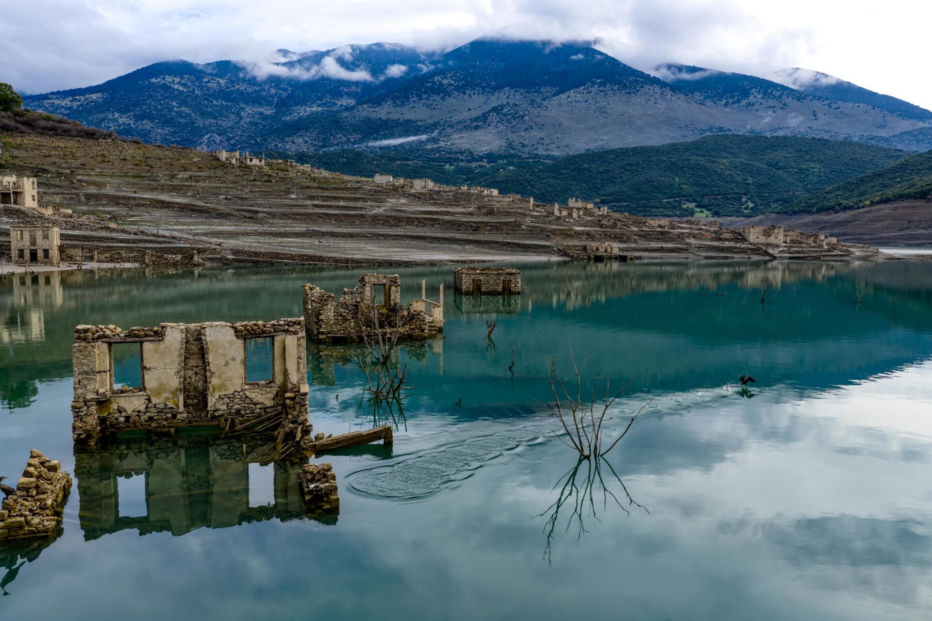 Νέες φωτογραφίες από drone αποτυπώνουν με εντυπωσιακό τρόπο τη ραγδαία υποχώρηση της στάθμης του νερού, αποκαλύπτοντας το παλιό χωριό Κάλλιο, το οποίο είχε καταποντιστεί το 1980 κατά τη δημιουργία της τεχνητής λίμνης.