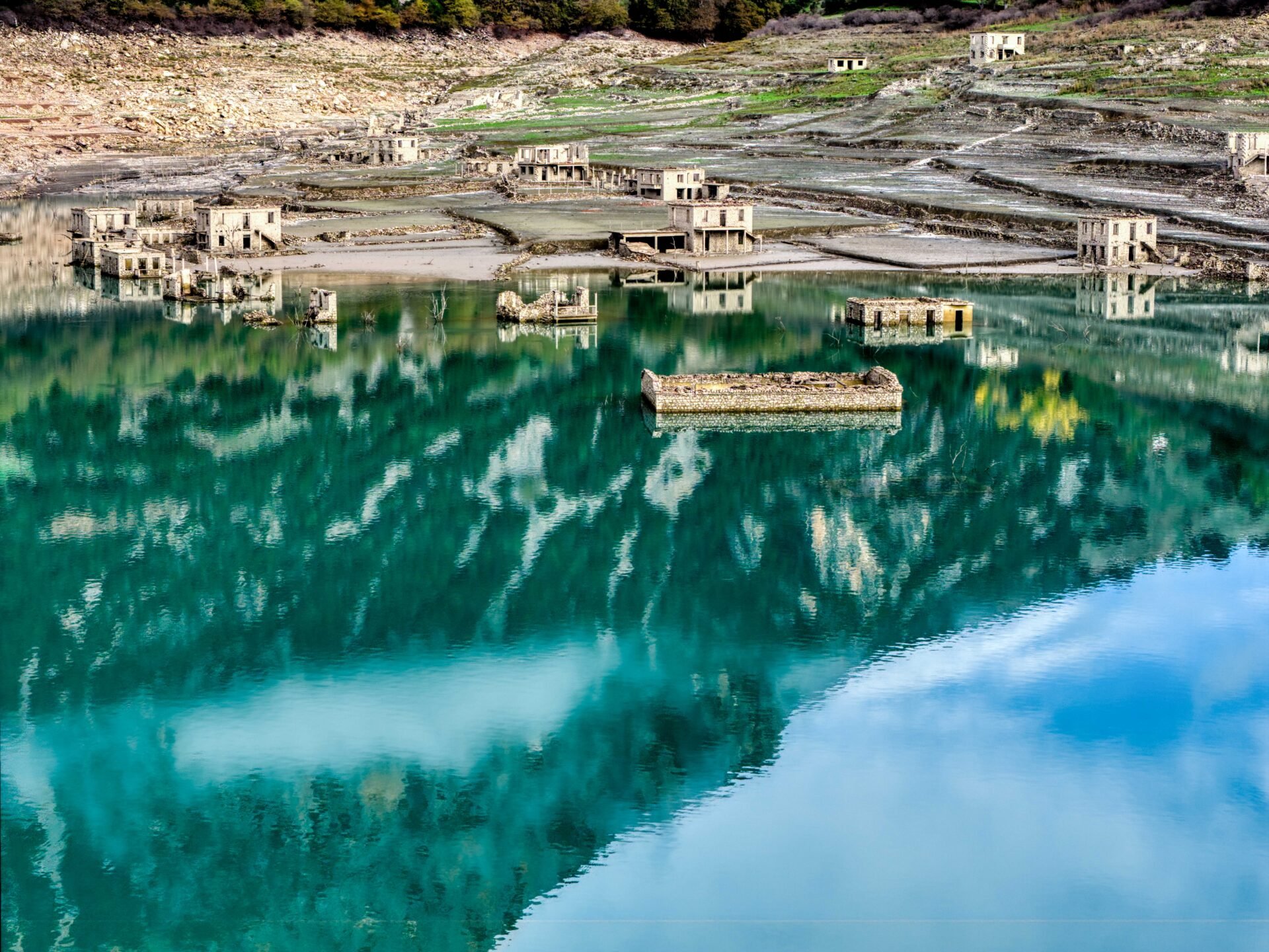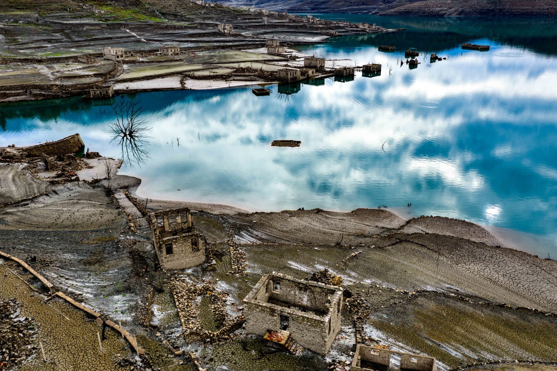 Το Κάλλιο, που εγκαταλείφθηκε από τους κατοίκους του πριν από 45 χρόνια, επανεμφανίστηκε φέτος καθώς η στάθμη του νερού έχει πέσει δραματικά. Οι κάτοικοι των γύρω περιοχών βλέπουν για πρώτη φορά μετά από δεκαετίες κτίρια, εκκλησίες και πέτρινα ερείπια να ξεπροβάλλουν από τον πυθμένα της λίμνης –μια εικόνα που πολλοί περιγράφουν ως συγκλονιστική υπενθύμιση των επιπτώσεων της κλιματικής κρίσης.